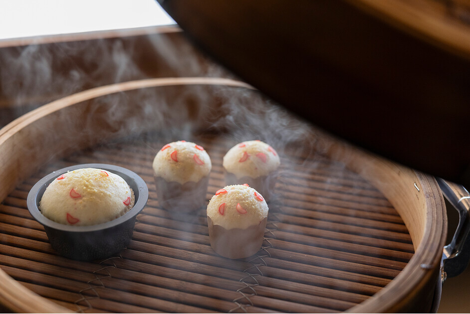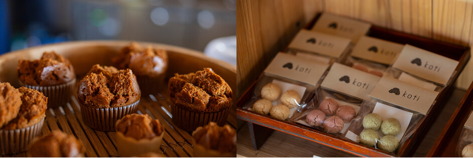 「koti」という店名は、地名の東風平(こちんだ)と、春の訪れを告げる風を表す「東風(こち)」から名付けられた。ここでいただけるのは、黒糖アガラサー(黒糖を使った蒸しパン)やチンスコウ、沖縄風卵カステラのチールンコウ(鶏卵餻)、花ぼうる(花模様の切込みを入れた焼き菓子)などの琉球菓子。