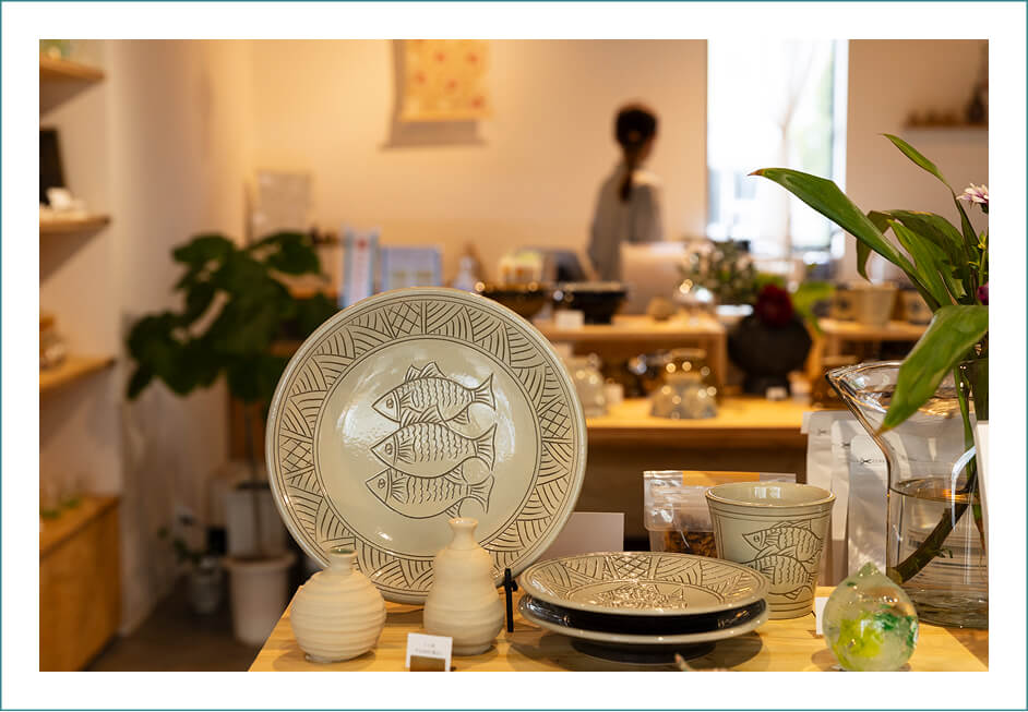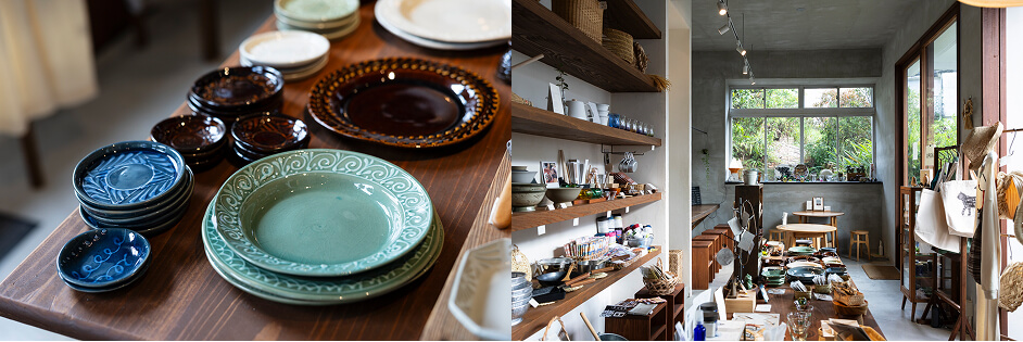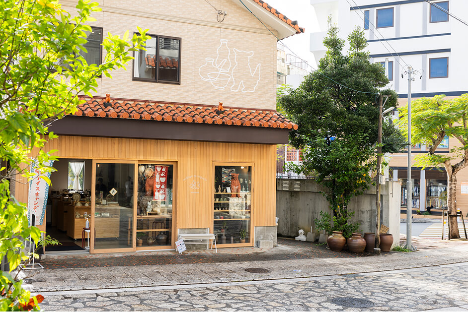 「今、8つの拠点がありますが、それぞれの店舗が異なるテーマや世界観を持っていて、器販売だけでなく、陶芸体験やワークショップ、カフェなどを通して、壼屋のまち全体の景色や文化を感じていただける場所づくりを行っています。一番新しい店舗の『壼屋のいりぐち』は、育陶園の器以外にも沖縄の自然素材や技術を活かした工芸品やアクセサリー、食やコスメなど日常を彩るアイテムのセレクトショップです。通りに入ってすぐの場所にあるので、壼屋を訪れた方にやちむん通りの文化や世界観を知ってもらえるような場所にしたかったんです」