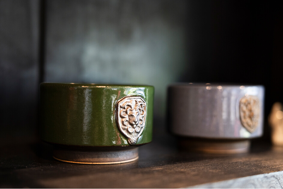 直営店舗の内訳は、まず育陶園を代表するブランド『唐草線彫』『育陶園獅子』をメインに扱う「壼屋焼窯元 育陶園 本店」。“美しい壼屋焼き”がテーマで、伝統技法「線彫」が施された器は重厚で整っており、貫禄がある。