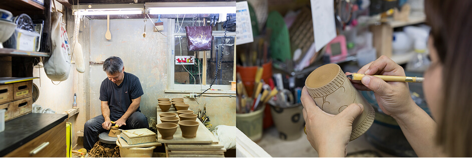 高江洲さんが代表に就任してから、育陶園では陶芸業界でもいち早く法人化を進め、社会保障の整備を行い、年内完全有給消化や職人のフレックスタイム制導入など、働きやすい職場づくりに力を入れてきた。その甲斐あって、育陶園では勤務5年以上の職人定着率が80%以上となり、熟練の職人が高い技術力を発揮して難しい表現を実現できている。