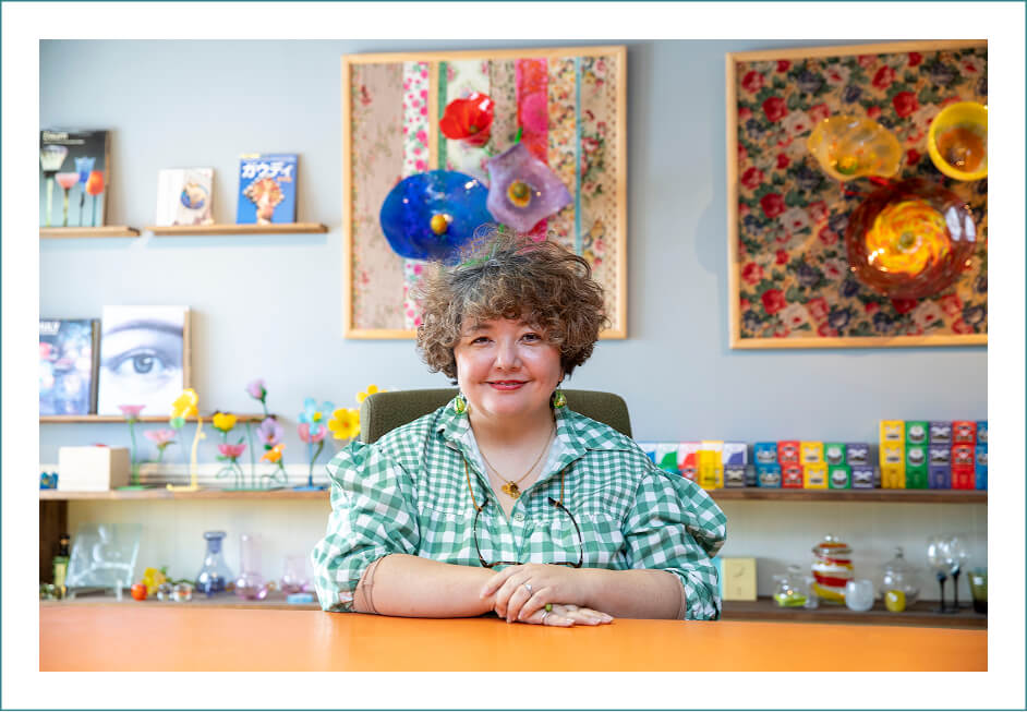 代表取締役社長の稲嶺佳乃さんにとって、琉球ガラスは幼い頃から身近な存在だった。父がガラス工房を経営していたこともあり、工房で働く職人たちの姿を見ながら育ったという。炎の前でガラスを吹き上げる職人の姿は、子どもの頃の記憶として強く印象に残っている。
